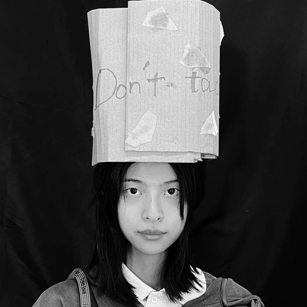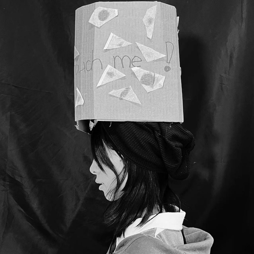 To design this model, I used cardboard boxes, newspapers, gauze and other materials. This gauze is pasted on the surface of the carton, and then I write do not touch me. The theme I want to convey is: I remember many people touched me, but no one really opened my heart. The gauze left the mark of the person who touched me, and the newspaper was the ladder of time. Carton is my hard body, This picture changed from black and white to colorful, which is the process of opening my heart slowly .don’t touch me, please love me.